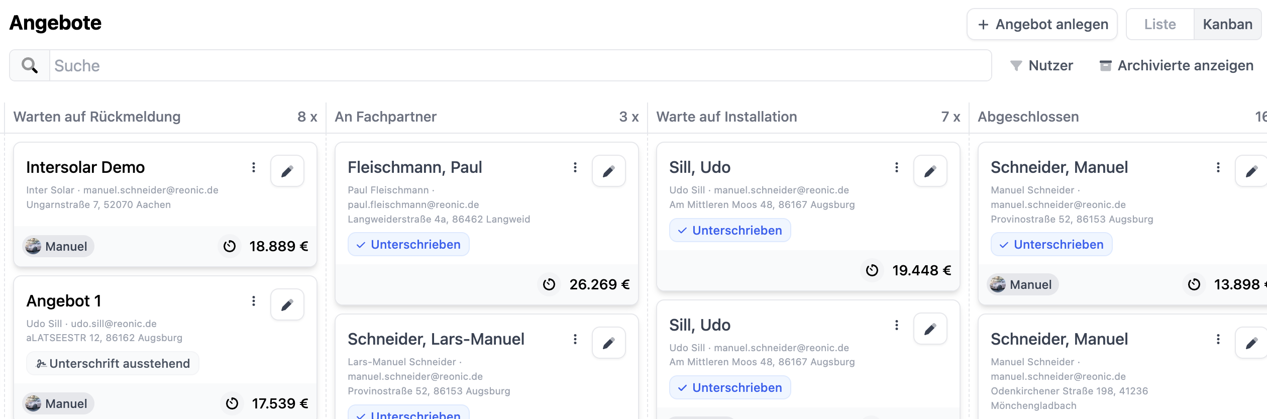 Du kannst die Angebote entweder als Kanban visualisieren, dann werden alle Angebote tabellarisch in ihrem jeweiligen Status angezeigt und der aktuelle Bearbeitungsstand ist sofort ersichtlich.