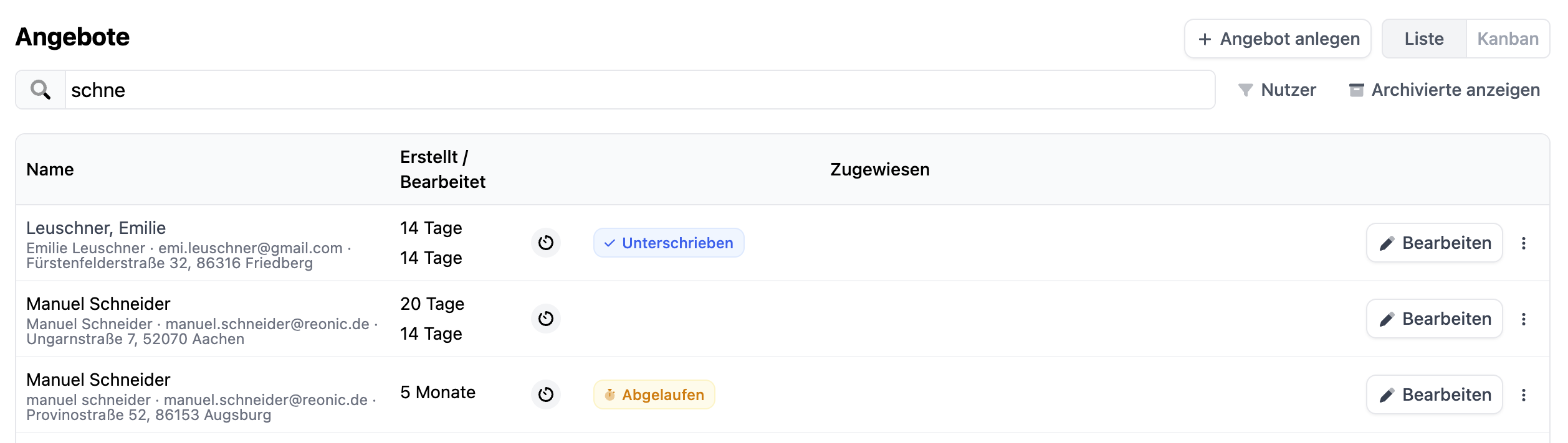 Wenn du die Liste auswählst, siehst du sofort, wann das Angebot erstellt wurde. In beiden Darstellungen kannst du jedem Angebot einen Nutzer zuweisen, der für die Bearbeitung verantwortlich ist, und nach dem Nutzer filtern.